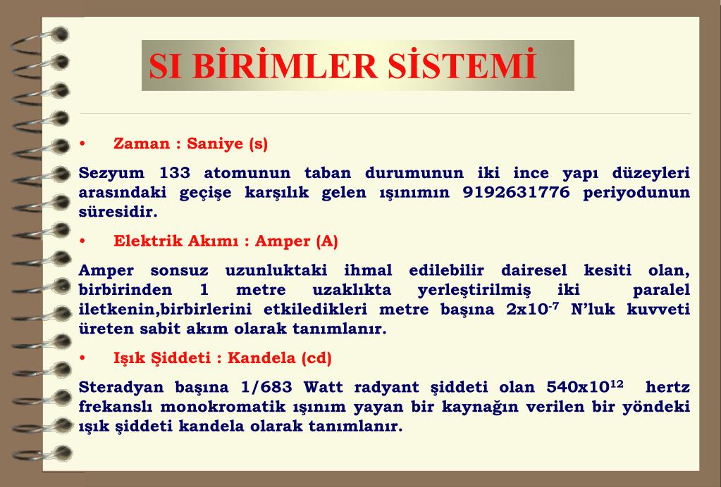 SI BİRİMLER SİSTEMİ • Zaman : Saniye (s) • Sezyum 133 atomunun taban durumunun iki ince yapı düzeyleri arasındaki geçişe karşılık gelen ışınımın 9192631776 periyodunun süresidir. • Elektrik Akımı : Amper (A) • Amper sonsuz uzunluktaki ihmal edilebilir dairesel kesiti olan, birbirinden 1 metre uzaklıkta yerleştirilmiş iki paralel iletkenin,birbirlerini etkiledikleri metre başına 2x10-7 N’luk kuvveti üreten sabit akım olarak tanımlanır. • Işık Şiddeti : Kandela (cd) • Steradyan başına 1/683 Watt radyant şiddeti olan 540x1012 hertz frekanslı monokromatik ışınım yayan bir kaynağın verilen bir yöndeki ışık şiddeti kandela olarak tanımlanır.