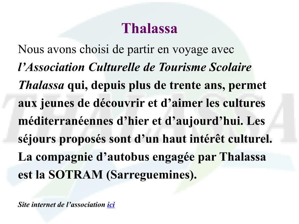 Thalassa Nous avons choisi de partir en voyage avec l’Association Culturelle de Tourisme Scolaire Thalassa qui, depuis plus de trente ans, permet aux jeunes de découvrir et d’aimer les cultures méditerranéennes d’hier et d’aujourd’hui. Les séjours proposés sont d’un haut intérêt culturel. La compagnie d’autobus engagée par Thalassa est la SOTRAM (Sarreguemines). Site internet de l’association ici