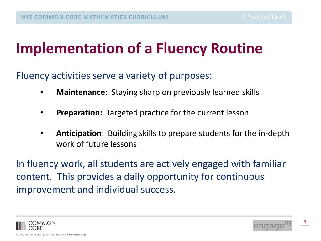 Implementation of a Fluency Routine • Fluency activities serve a variety of purposes: • Maintenance: Staying sharp on previously learned skills • Preparation: Targeted practice for the current lesson • Anticipation: Building skills to prepare students for the in-depth work of future lessons • In fluency work, all students are actively engaged with familiar content. This provides a daily opportunity for continuous improvement and individual success.