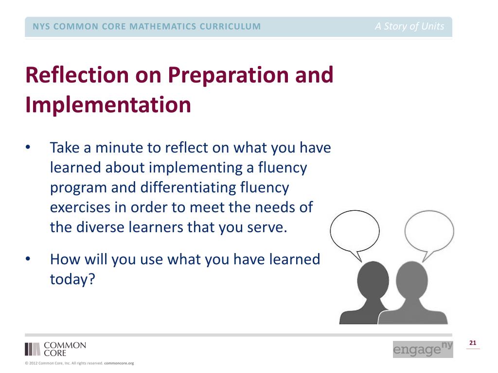 Implementation of a Fluency Routine • What concerns do you have about implementing a fluency program as you introduce A Story of Units? • What steps can we take to overcome these concerns our group has identified?
