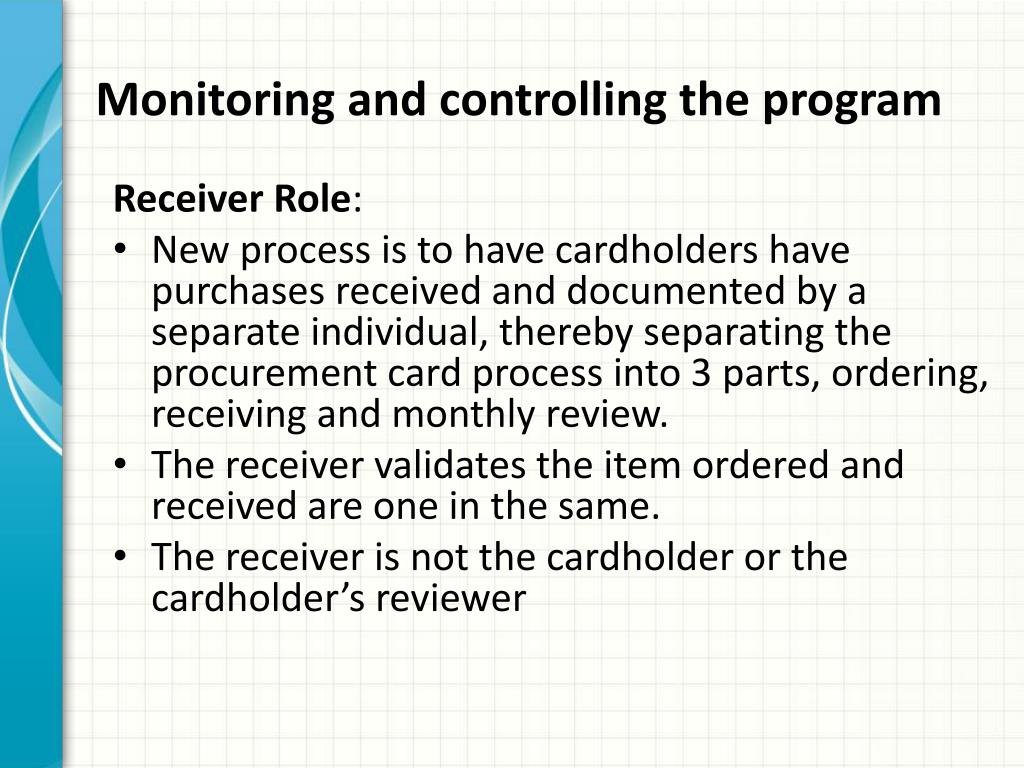 Monitoring and controllingthe program Receiver Role: • New process is to have cardholders have purchases received and documented by a separate individual, thereby separating the procurement card process into 3 parts, ordering, receiving and monthly review. • The receiver validates the item ordered and received are one in the same. • The receiver is not the cardholder or the cardholder’s reviewer