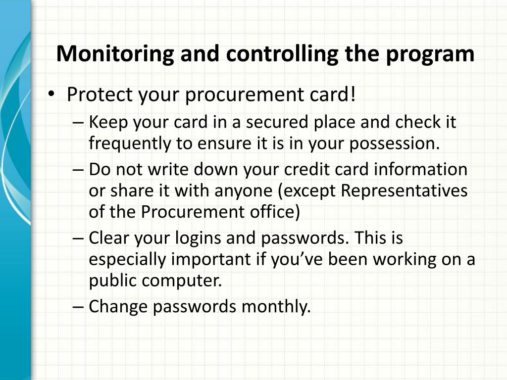 Monitoring and controllingthe program • Protect your procurement card! • Keep your card in a secured place and check it frequently to ensure it is in your possession. • Do not write down your credit card information or share it with anyone (except Representatives of the Procurement office) • Clear your logins and passwords. This is especially important if you’ve been working on a public computer. • Change passwords monthly.