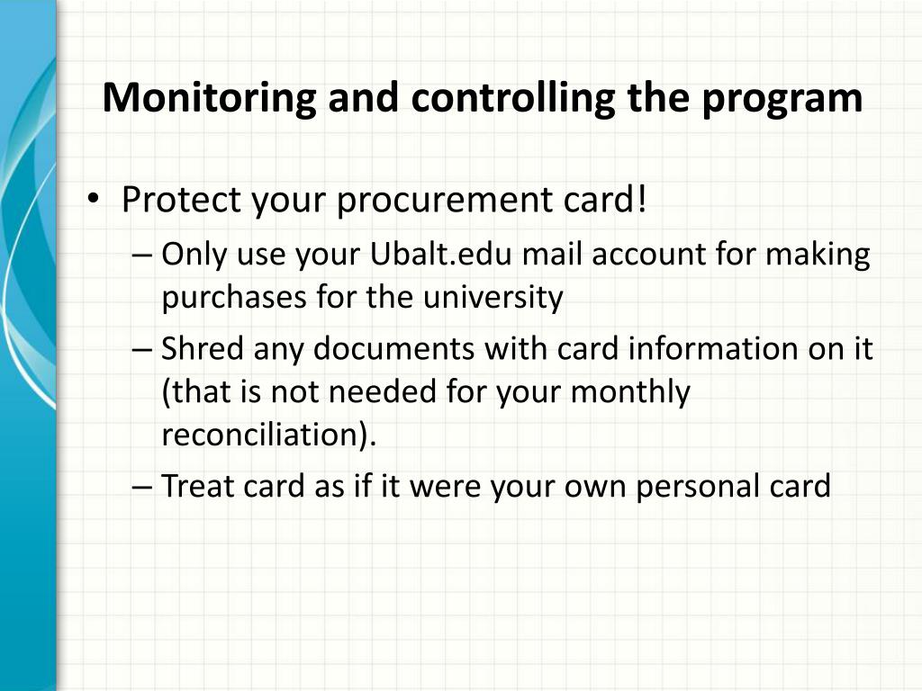Monitoring and controllingthe program • Protect your procurement card! • Only use your Ubalt.edu mail account for making purchases for the university • Shred any documents with card information on it (that is not needed for your monthly reconciliation). • Treat card as if it were your own personal card