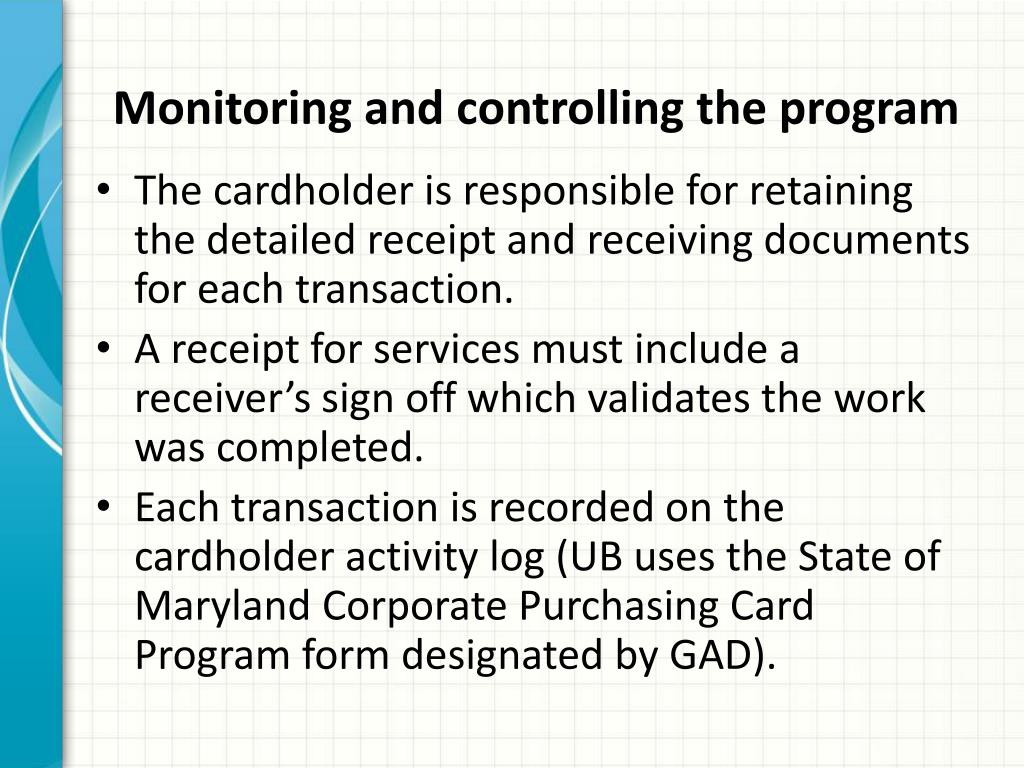 Monitoring and controllingthe program • The cardholder is responsible for retaining the detailed receipt and receiving documents for each transaction. • A receipt for services must include a receiver’s sign off which validates the work was completed. • Each transaction is recorded on the cardholder activity log (UB uses the State of Maryland Corporate Purchasing Card Program form designated by GAD).