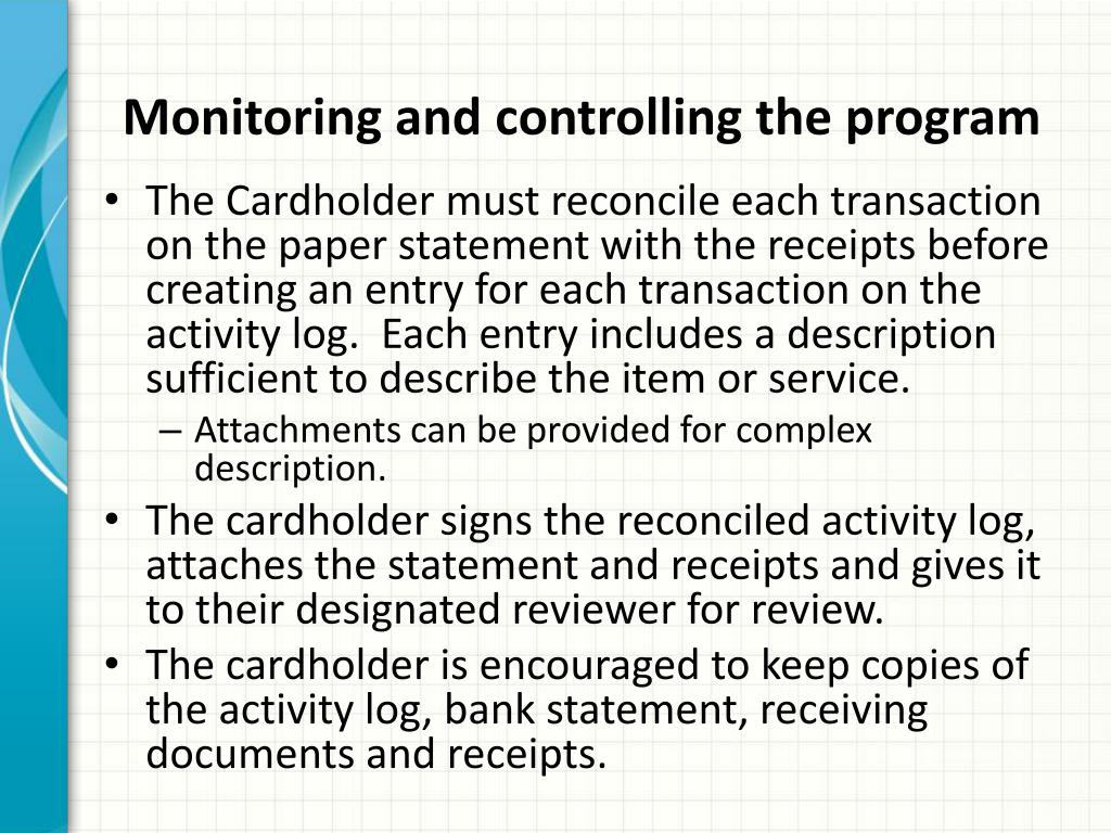 Monitoring and controllingthe program • The Cardholder must reconcile each transaction on the paper statement with the receipts before creating an entry for each transaction on the activity log. Each entry includes a description sufficient to describe the item or service. • Attachments can be provided for complex description. • The cardholder signs the reconciled activity log, attaches the statement and receipts and gives it to their designated reviewer for review. • The cardholder is encouraged to keep copies of the activity log, bank statement, receiving documents and receipts.