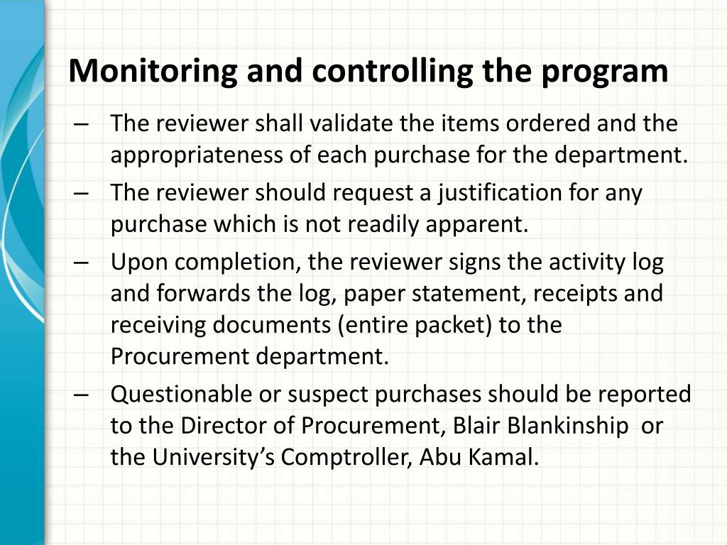 Monitoring and controllingthe program • The reviewer shall validate the items ordered and the appropriateness of each purchase for the department. • The reviewer should request a justification for any purchase which is not readily apparent. • Upon completion, the reviewer signs the activity log and forwards the log, paper statement, receipts and receiving documents (entire packet) to the Procurement department. • Questionable or suspect purchases should be reported to the Director of Procurement, Blair Blankinship or the University’s Comptroller, Abu Kamal.