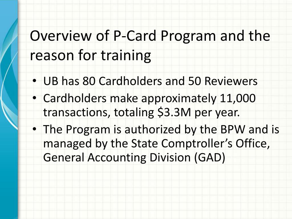 Overview of P-Card Program and the reason for training • UB has 80 Cardholders and 50 Reviewers • Cardholders make approximately 11,000 transactions, totaling $3.3M per year. • The Program is authorized by the BPW and is managed by the State Comptroller’s Office, General Accounting Division (GAD)