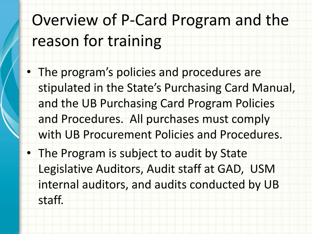 Overview of P-Card Program and the reason for training • The program’s policies and procedures are stipulated in the State’s Purchasing Card Manual, and the UB Purchasing Card Program Policies and Procedures. All purchases must comply with UB Procurement Policies and Procedures. • The Program is subject to audit by State Legislative Auditors, Audit staff at GAD, USM internal auditors, and audits conducted by UB staff.