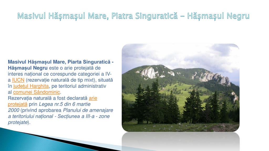 Masivul Hășmașul Mare, Piatra Singuratică - Hășmașul Negru MasivulHășmașul Mare, PiartaSinguratică - HășmașulNegrueste o arieprotejată de interesnaționalcecorespundecategoriei a IV-a IUCN (rezervațienaturală de tip mixt), situatăînjudețulHarghita, peteritoriuladministrativ al comuneiSândominic. Rezervațianaturală a fostdeclaratăarieprotejatăprinLegea nr.5 din 6 martie 2000 (privindaprobareaPlanului de amenajare a teritoriuluinațional - Secțiunea a III-a - zone protejate).