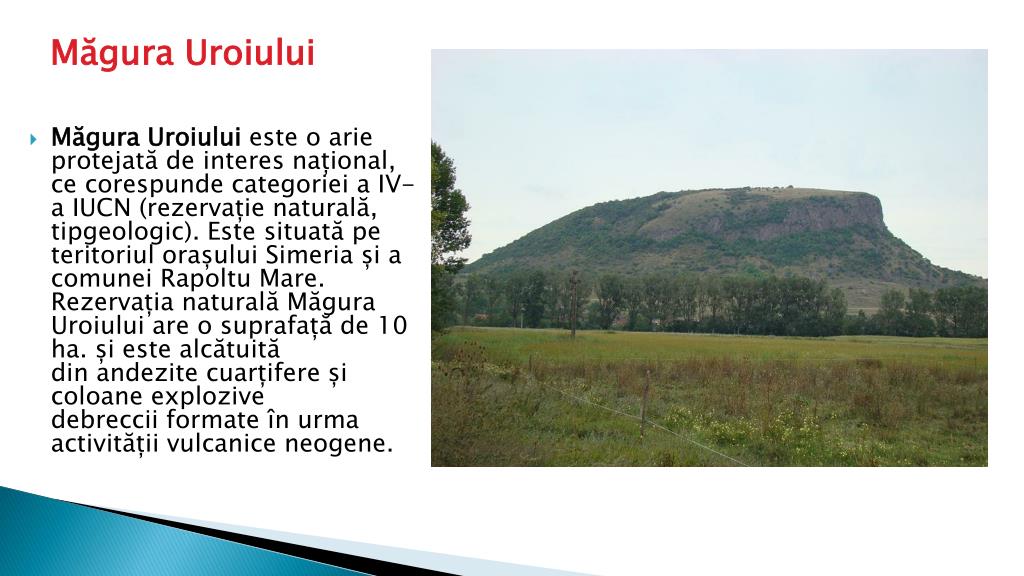 MăguraUroiului • MăguraUroiuluieste o arieprotejatăde interesnațional, cecorespundecategoriei a IV-a IUCN (rezervațienaturală, tipgeologic). Este situatăpeteritoriulorașuluiSimeriași a comuneiRapoltu Mare.RezervațianaturalăMăguraUroiului are o suprafață de 10 ha. șiestealcătuită din andezitecuarțifereșicoloaneexplozivedebrecciiformateînurmaactivitățiivulcaniceneogene.