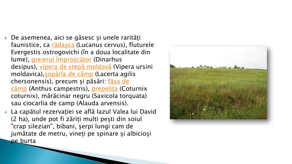 De asemenea, aici se găsescșiuneleraritățifaunistice, carădașca (Lucanuscervus), flutureleEvergestisostrogovichi (în a doualocalitate din lume), greierulîmproșcător (Dinarhusdesipus), vipera de stepămoldavă (Viperaursinimoldavica),șopârla de câmp (Lacertaagilischersonensis), precumșipăsări: fâsa de câmp (Anthuscampestris), prepelița (Coturnixcoturnix), mărăcinarnegru (Saxicolatorquata) sauciocarlia de camp (Alaudaarvensis). • La capătulrezervației se aflăIazulValealui David (2 ha), unde pot fi zăriți multi pești din soiul "crap silezian", bibani, șerpi lungi cam de jumătate de metru, vinețipespinareșialbicioșipeburta