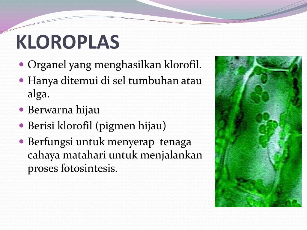 KLOROPLAS • Organel yang menghasilkanklorofil. • Hanyaditemuidiseltumbuhanatau alga. • Berwarnahijau • Berisiklorofil (pigmenhijau) • Berfungsiuntukmenyeraptenagacahayamatahariuntukmenjalankanprosesfotosintesis.