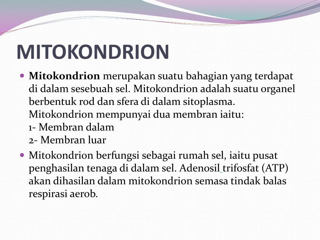 MITOKONDRION • Mitokondrion merupakan suatu bahagian yang terdapat di dalam sesebuah sel. Mitokondrion adalah suatu organel berbentuk rod dan sfera di dalam sitoplasma. Mitokondrion mempunyai dua membran iaitu:1- Membran dalam2- Membran luar • Mitokondrion berfungsi sebagai rumah sel, iaitu pusat penghasilan tenaga di dalam sel. Adenosiltrifosfat (ATP) akan dihasilan dalam mitokondrion semasa tindak balas respirasi aerob.
