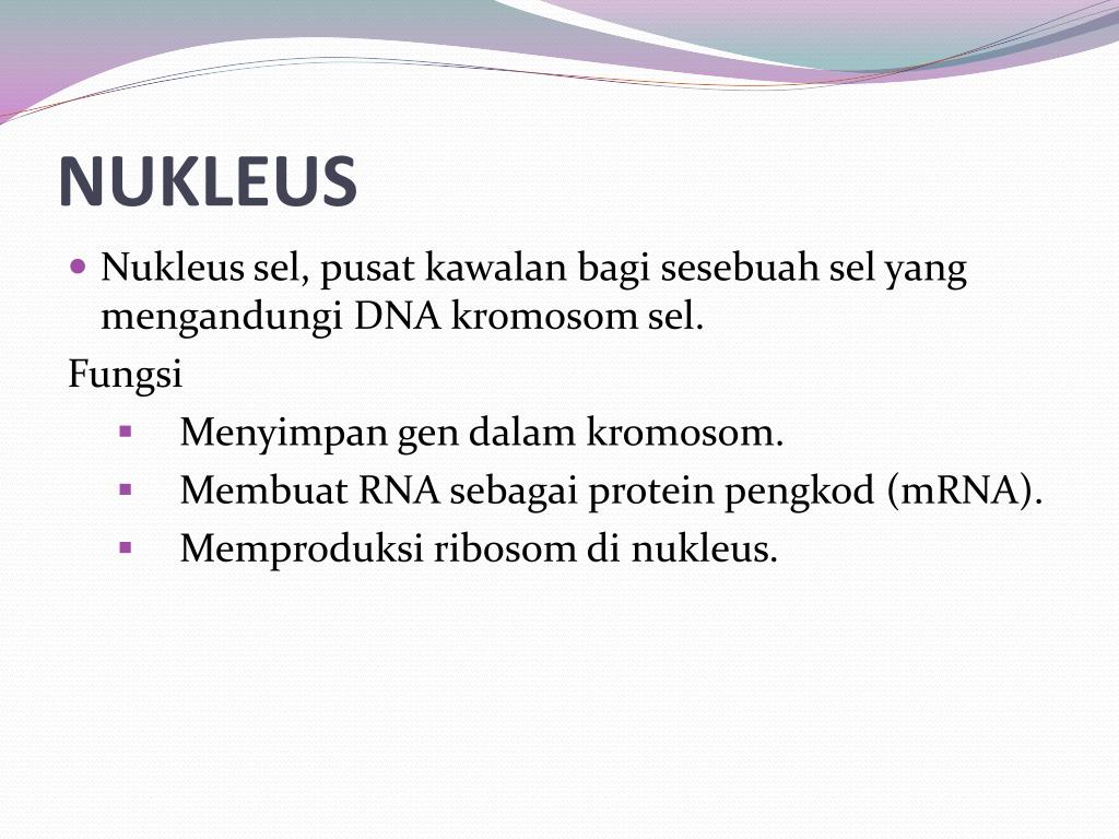 NUKLEUS • Nukleussel, pusatkawalanbagisesebuahsel yang mengandungi DNA kromosom sel. Fungsi • Menyimpan gen dalamkromosom. • Membuat RNA sebagai protein pengkod (mRNA). • Memproduksiribosomdinukleus.
