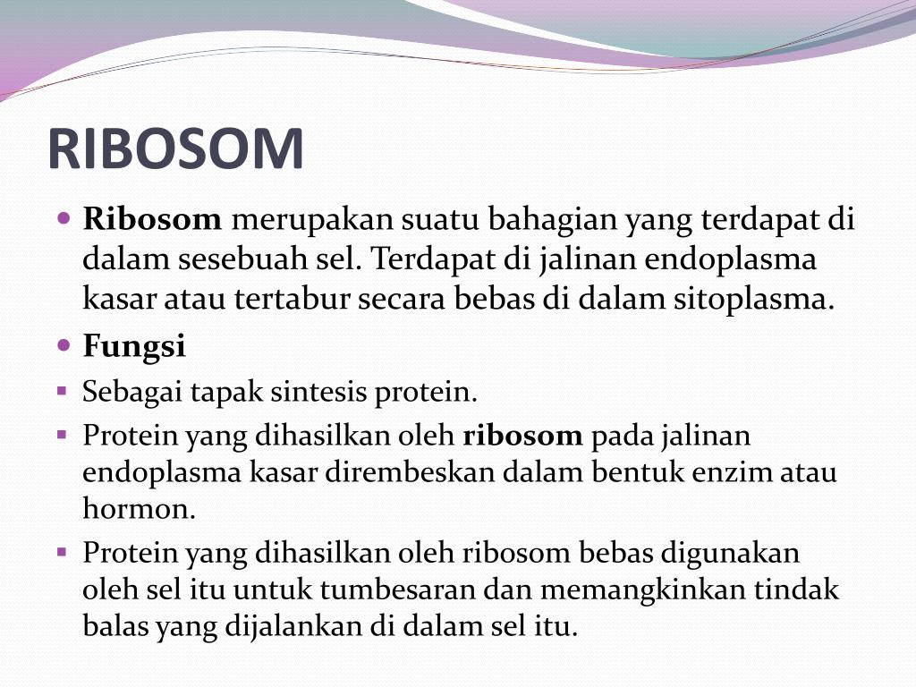 RIBOSOM • Ribosom merupakan suatu bahagian yang terdapat di dalam sesebuah sel. Terdapat di jalinan endoplasma kasar atau tertabur secara bebas di dalam sitoplasma. • Fungsi • Sebagai tapak sintesis protein. • Protein yang dihasilkan oleh ribosom pada jalinan endoplasma kasar dirembeskan dalam bentuk enzim atau hormon. • Protein yang dihasilkan oleh ribosom bebas digunakan oleh sel itu untuk tumbesaran dan memangkinkan tindak balas yang dijalankan di dalam sel itu.