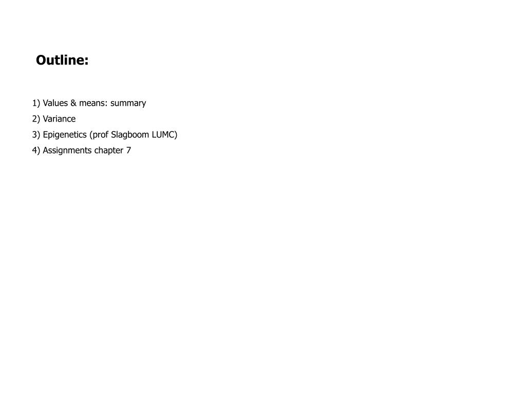 Outline: 1) Values & means: summary2) Variance3) Epigenetics (profSlagboom LUMC)4) Assignments chapter 7