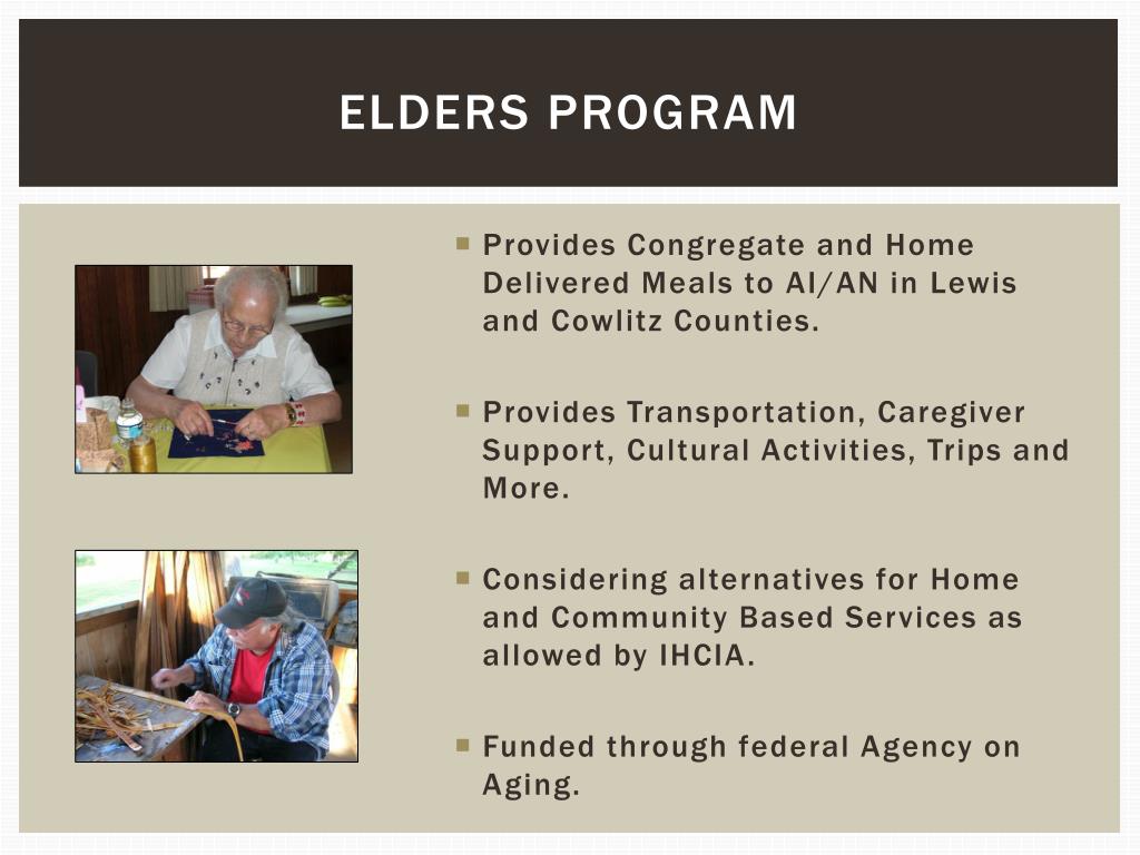 Elders Program • Provides Congregate and Home Delivered Meals to AI/AN in Lewis and Cowlitz Counties. • Provides Transportation, Caregiver Support, Cultural Activities, Trips and More. • Considering alternatives for Home and Community Based Services as allowed by IHCIA. • Funded through federal Agency on Aging.