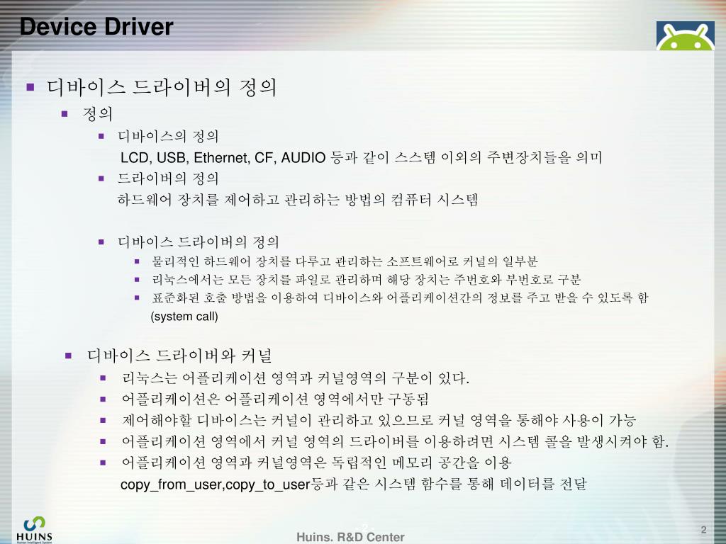 Device Driver • 디바이스 드라이버의 정의 • 정의 • 디바이스의 정의 LCD, USB, Ethernet, CF, AUDIO 등과 같이 스스템 이외의 주변장치들을 의미 • 드라이버의 정의 하드웨어 장치를 제어하고 관리하는 방법의 컴퓨터 시스템 • 디바이스 드라이버의 정의 • 물리적인 하드웨어 장치를 다루고 관리하는 소프트웨어로 커널의 일부분 • 리눅스에서는 모든 장치를 파일로 관리하며 해당 장치는 주번호와부번호로 구분 • 표준화된 호출 방법을 이용하여 디바이스와 어플리케이션간의 정보를 주고 받을 수 있도록 함 (system call) • 디바이스드라이버와 커널 • 리눅스는 어플리케이션 영역과 커널영역의 구분이 있다. • 어플리케이션은 어플리케이션 영역에서만 구동됨 • 제어해야할 디바이스는 커널이 관리하고 있으므로 커널 영역을 통해야 사용이 가능 • 어플리케이션 영역에서 커널 영역의 드라이버를 이용하려면 시스템 콜을 발생시켜야 함. • 어플리케이션 영역과 커널영역은 독립적인 메모리 공간을 이용 copy_from_user,copy_to_user등과 같은 시스템 함수를 통해 데이터를 전달