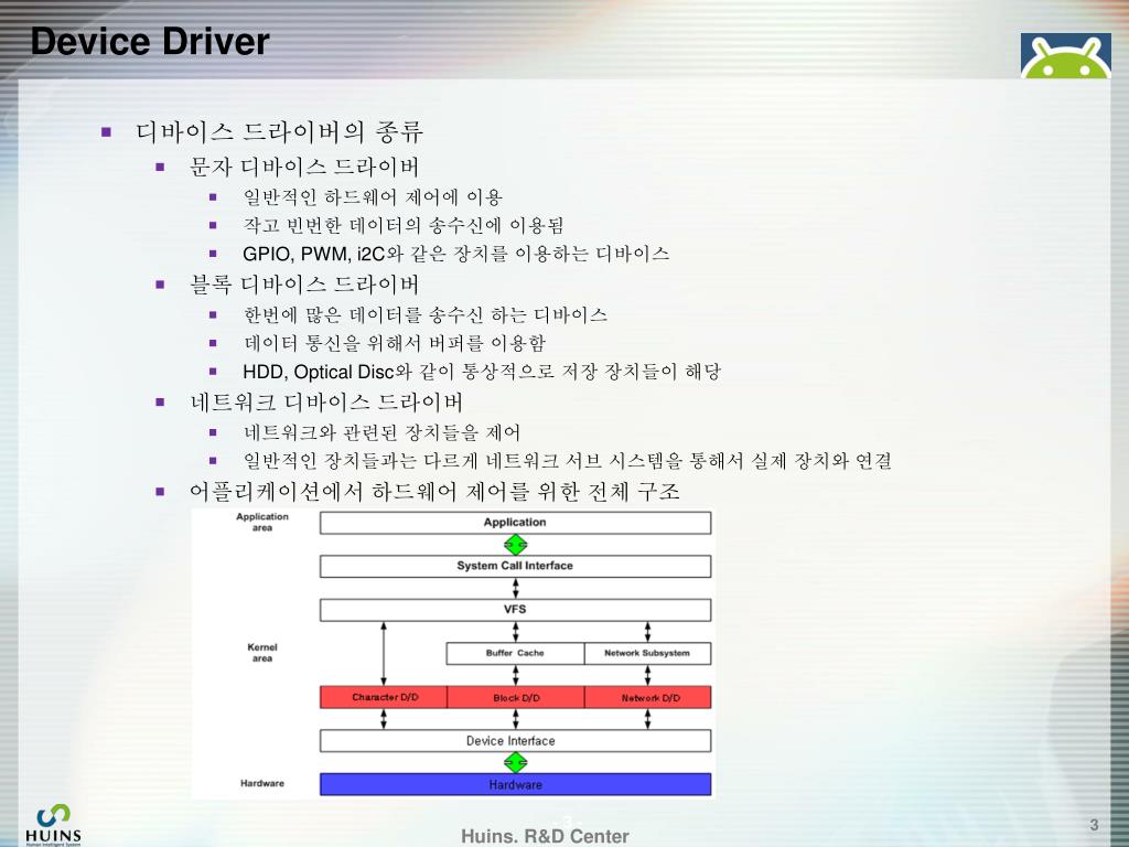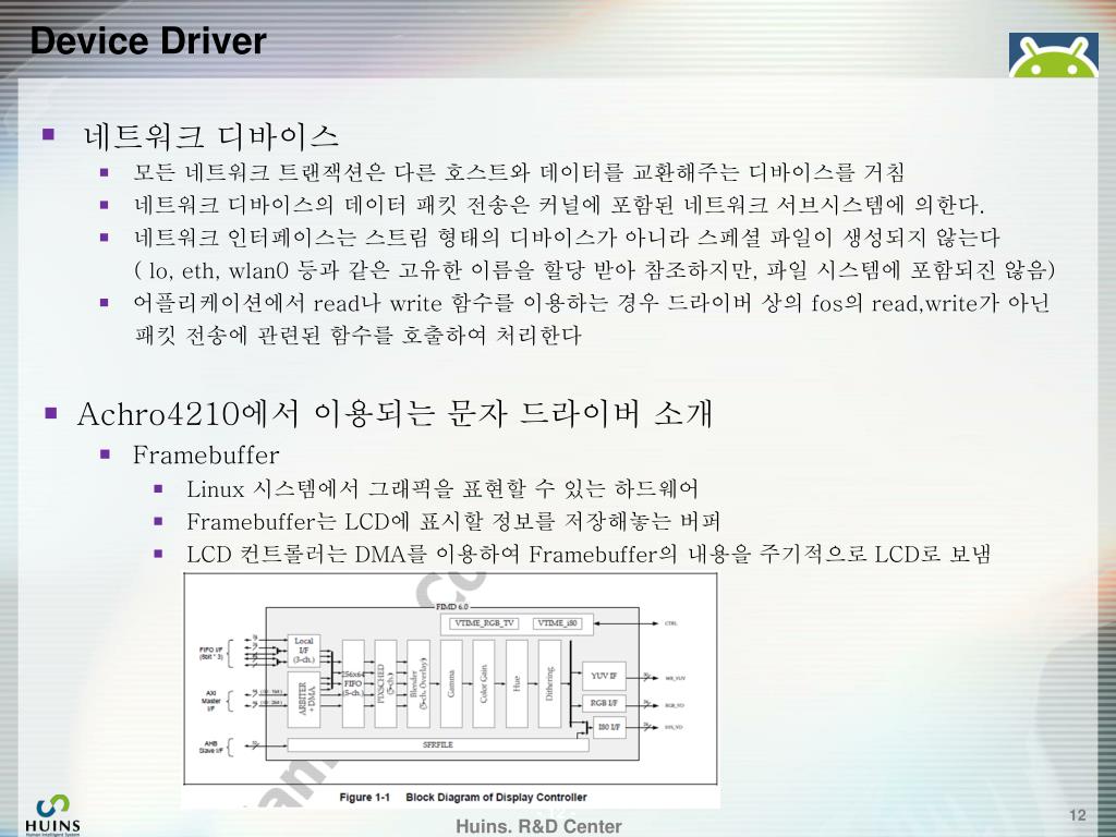 Device Driver • 네트워크디바이스 • 모든 네트워크 트랜잭션은 다른 호스트와 데이터를 교환해주는 디바이스를 거침 • 네트워크 디바이스의 데이터 패킷 전송은 커널에 포함된 네트워크 서브시스템에 의한다. • 네트워크 인터페이스는 스트림 형태의 디바이스가 아니라 스페셜 파일이 생성되지 않는다 ( lo, eth, wlan0 등과 같은 고유한 이름을 할당 받아 참조하지만, 파일 시스템에 포함되진 않음) • 어플리케이션에서 read나 write 함수를 이용하는 경우 드라이버 상의 fos의 read,write가 아닌 패킷 전송에 관련된 함수를 호출하여 처리한다 • Achro4210에서 이용되는 문자 드라이버 소개 • Framebuffer • Linux 시스템에서 그래픽을 표현할 수 있는 하드웨어 • Framebuffer는 LCD에 표시할 정보를 저장해놓는 버퍼 • LCD 컨트롤러는 DMA를 이용하여 Framebuffer의 내용을 주기적으로 LCD로 보냄