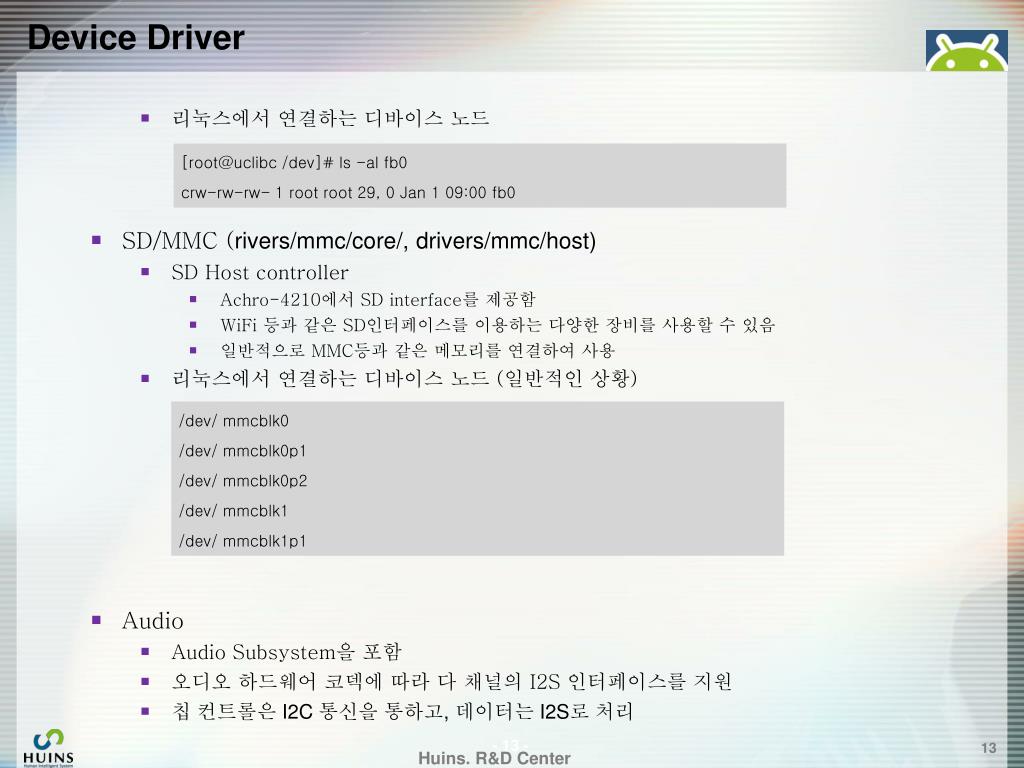 Device Driver • 리눅스에서 연결하는 디바이스 노드 • SD/MMC (rivers/mmc/core/, drivers/mmc/host) • SD Host controller • Achro-4210에서 SD interface를 제공함 • WiFi등과 같은 SD인터페이스를 이용하는 다양한 장비를 사용할 수 있음 • 일반적으로 MMC등과 같은 메모리를 연결하여 사용 • 리눅스에서 연결하는 디바이스 노드(일반적인 상황) • Audio • Audio Subsystem을 포함 • 오디오 하드웨어 코덱에 따라 다 채널의 I2S 인터페이스를 지원 • 칩 컨트롤은 I2C 통신을 통하고, 데이터는 I2S로 처리