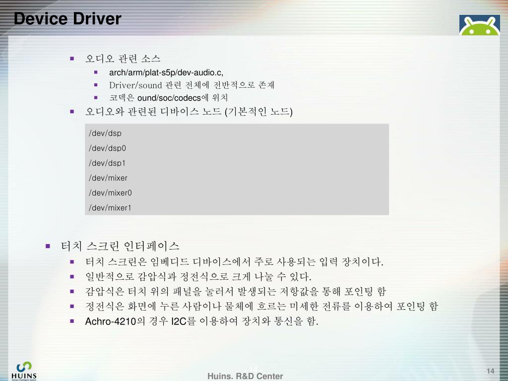 Device Driver • 오디오 관련 소스 • arch/arm/plat-s5p/dev-audio.c, • Driver/sound 관련 전체에 전반적으로 존재 • 코덱은ound/soc/codecs에 위치 • 오디오와 관련된 디바이스 노드(기본적인 노드) • 터치 스크린 인터페이스 • 터치 스크린은 임베디드 디바이스에서 주로 사용되는 입력 장치이다. • 일반적으로 감압식과정전식으로 크게 나눌 수 있다. • 감압식은 터치 위의 패널을 눌러서 발생되는 저항값을 통해 포인팅 함 • 정전식은 화면에 누른 사람이나 물체에 흐르는 미세한 전류를 이용하여 포인팅 함 • Achro-4210의 경우 I2C를 이용하여 장치와 통신을 함.