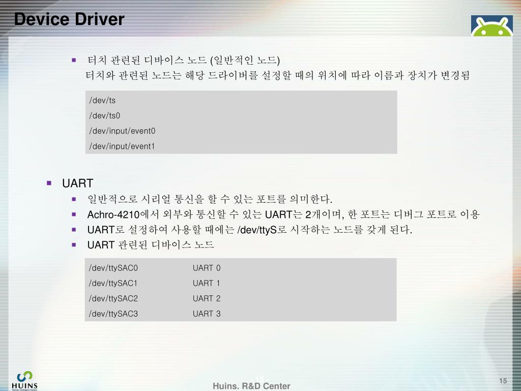 Device Driver • 터치 관련된 디바이스 노드(일반적인 노드) 터치와 관련된 노드는 해당 드라이버를 설정할 때의 위치에 따라 이름과 장치가 변경됨 • UART • 일반적으로시리얼 통신을 할 수 있는 포트를 의미한다. • Achro-4210에서 외부와 통신할 수 있는 UART는 2개이며, 한 포트는 디버그 포트로 이용 • UART로 설정하여 사용할 때에는 /dev/ttyS로시작하는 노드를 갖게 된다. • UART 관련된 디바이스 노드