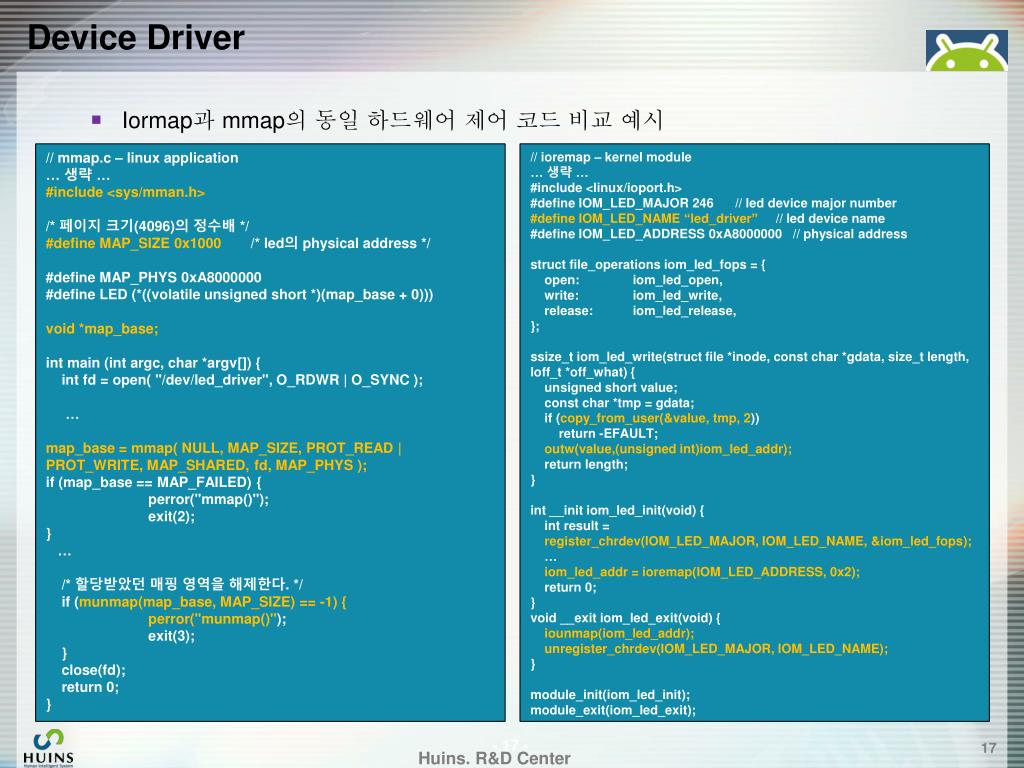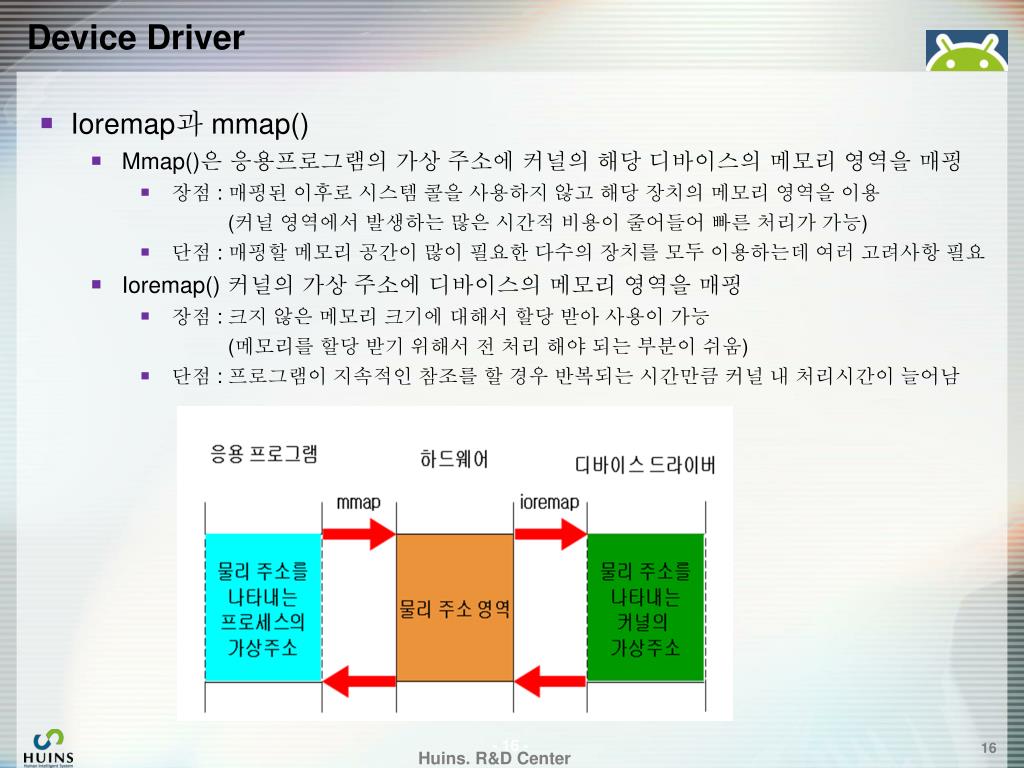 Device Driver • Ioremap과 mmap() • Mmap()은 응용프로그램의 가상 주소에 커널의 해당 디바이스의 메모리 영역을 매핑 • 장점 : 매핑된 이후로 시스템 콜을 사용하지 않고 해당 장치의 메모리 영역을 이용 (커널 영역에서 발생하는 많은 시간적 비용이 줄어들어 빠른 처리가 가능) • 단점 : 매핑할 메모리 공간이 많이 필요한 다수의 장치를 모두 이용하는데 여러 고려사항 필요 • Ioremap() 커널의 가상 주소에 디바이스의 메모리 영역을 매핑 • 장점 : 크지 않은 메모리 크기에 대해서 할당 받아 사용이 가능 (메모리를 할당 받기 위해서 전 처리 해야 되는 부분이 쉬움) • 단점 : 프로그램이 지속적인 참조를 할 경우 반복되는 시간만큼 커널내 처리시간이 늘어남