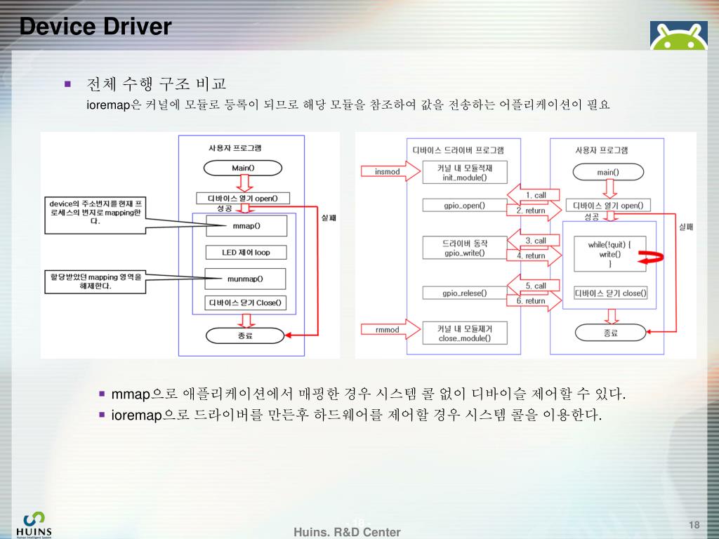 Device Driver • 전체 수행 구조 비교 ioremap은 커널에 모듈로 등록이 되므로 해당 모듈을 참조하여 값을 전송하는 어플리케이션이 필요 • mmap으로 애플리케이션에서 매핑한 경우 시스템 콜 없이 디바이슬 제어할 수 있다. • ioremap으로 드라이버를 만든후 하드웨어를 제어할 경우 시스템 콜을 이용한다.