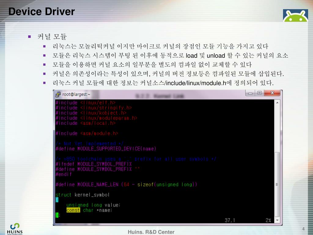 Device Driver • 커널 모듈 • 리눅스는모놀리틱커널 이지만 마이크로 커널의 장점인 모듈 기능을 가지고 있다 • 모듈은 리눅스 시스템이 부팅 된 이후에 동적으로 load 및 unload 할 수 있는 커널의 요소 • 모듈을 이용하면 커널 요소의 일부분을 별도의 컴파일 없이 교체할 수 있다 • 커널은 의존성이라는 특성이 있으며, 커널의 버전 정보등은컴파일된 모듈에 삽입된다. • 리눅스커널 모듈에 대한 정보는 커널소스/include/linux/module.h에 정의되어 있다.