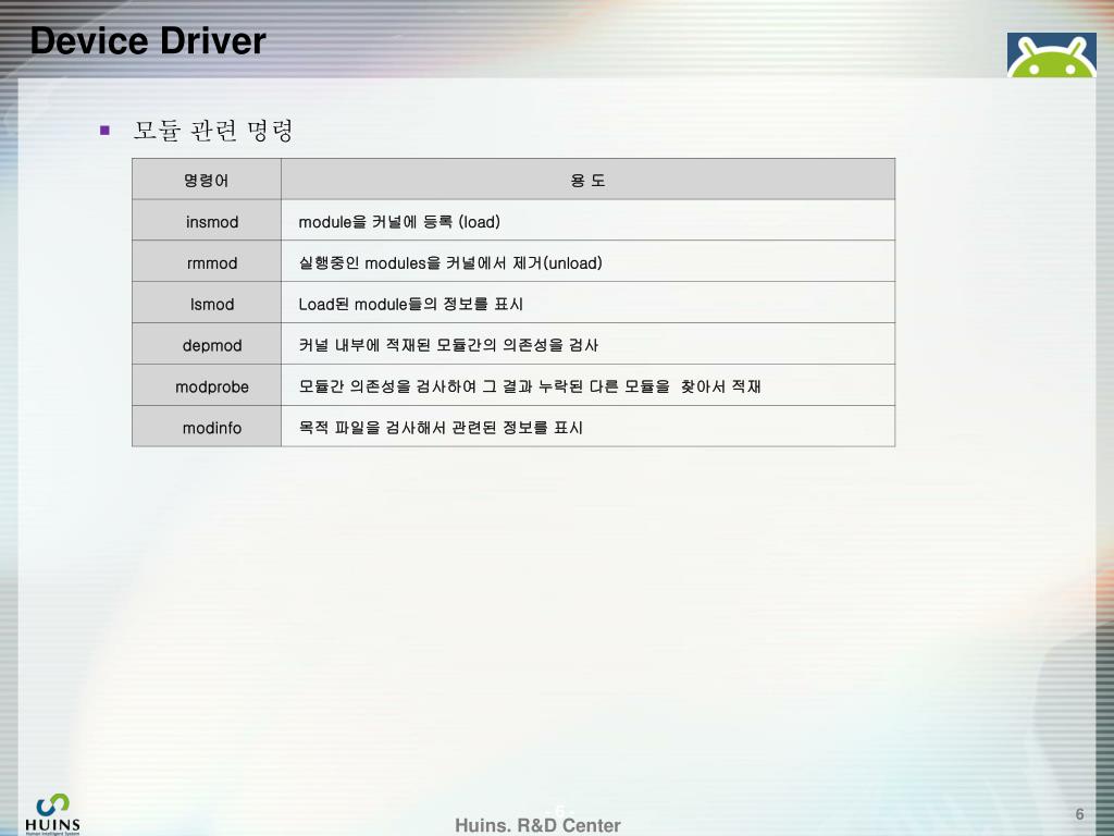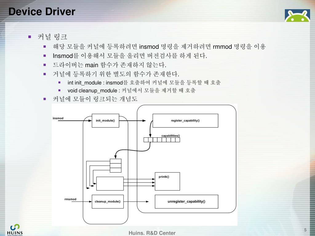 Device Driver • 커널 링크 • 해당 모듈을 커널에 등록하려면 insmod명령을 제거하려면 rmmod명령을 이용 • Insmod를 이용해서 모듈을 올리면 버전검사를 하게 된다. • 드라이버는 main 함수가 존재하지 않는다. • 거널에 등록하기 위한 별도의 함수가 존재한다. • intinit_module : insmod를 호출하여 커널에 모듈을 등록할 때 호출 • void cleanup_module : 커널에서 모듈을 제거할 때 호출 • 커널에 모듈이 링크되는 개념도