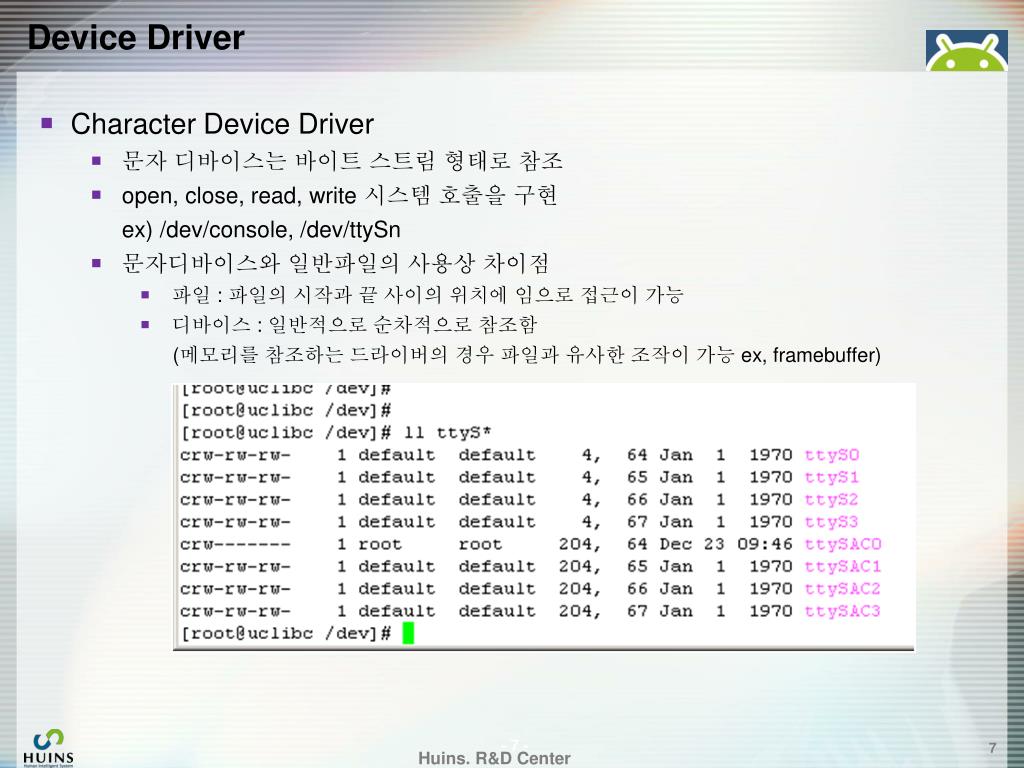 Device Driver • Character Device Driver • 문자디바이스는 바이트 스트림 형태로 참조 • open, close, read, write 시스템 호출을 구현 ex) /dev/console, /dev/ttySn • 문자디바이스와 일반파일의 사용상 차이점 • 파일 : 파일의 시작과 끝 사이의 위치에 임으로 접근이 가능 • 디바이스 : 일반적으로 순차적으로 참조함 (메모리를 참조하는 드라이버의 경우 파일과 유사한 조작이 가능 ex, framebuffer)
