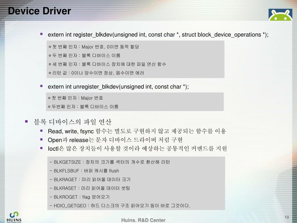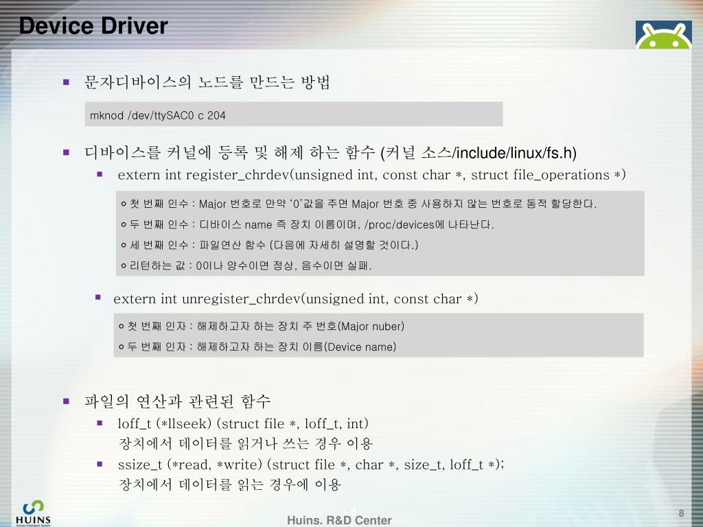 Device Driver • 문자디바이스의노드를 만드는 방법 • 디바이스를 커널에 등록 및 해제 하는 함수 (커널 소스/include/linux/fs.h) • extern intregister_chrdev(unsigned int, const char *, structfile_operations *) • extern intunregister_chrdev(unsigned int, const char *) • 파일의 연산과 관련된 함수 • loff_t (*llseek) (struct file *, loff_t, int) 장치에서 데이터를 읽거나 쓰는 경우 이용 • ssize_t (*read, *write) (struct file *, char *, size_t, loff_t *); 장치에서 데이터를 읽는 경우에 이용