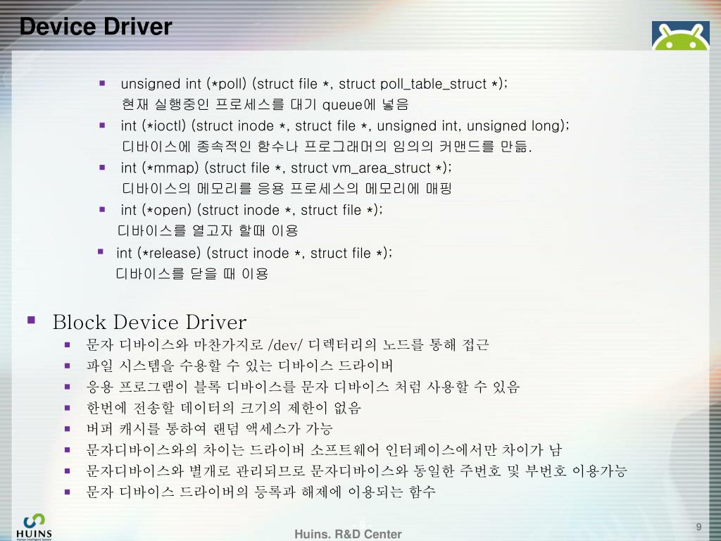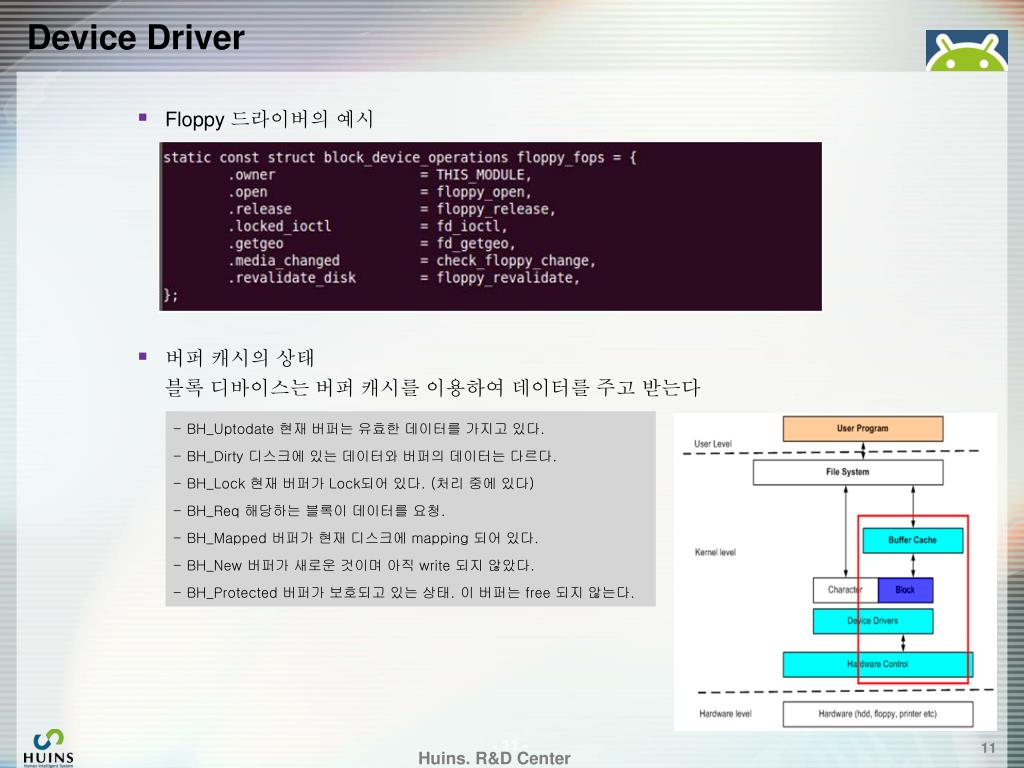 Device Driver • unsigned int (*poll) (struct file *, structpoll_table_struct *); 현재 실행중인 프로세스를 대기 queue에 넣음 • int (*ioctl) (structinode *, struct file *, unsigned int, unsigned long); 디바이스에 종속적인 함수나 프로그래머의 임의의 커맨드를 만듦. • int (*mmap) (struct file *, structvm_area_struct *); 디바이스의 메모리를 응용 프로세스의 메모리에 매핑 • int (*open) (structinode *, struct file *); 디바이스를 열고자 할때 이용 • int (*release) (structinode *, struct file *); 디바이스를 닫을 때 이용 • BlockDevice Driver • 문자디바이스와 마찬가지로 /dev/ 디렉터리의 노드를 통해 접근 • 파일 시스템을 수용할 수 있는 디바이스 드라이버 • 응용 프로그램이 블록 디바이스를 문자 디바이스 처럼 사용할 수 있음 • 한번에 전송할 데이터의 크기의 제한이 없음 • 버퍼 캐시를 통하여 랜덤 액세스가 가능 • 문자디바이스와의 차이는 드라이버 소프트웨어 인터페이스에서만 차이가 남 • 문자디바이스와 별개로 관리되므로 문자디바이스와 동일한 주번호 및 부번호 이용가능 • 문자 디바이스 드라이버의 등록과 해제에 이용되는 함수
