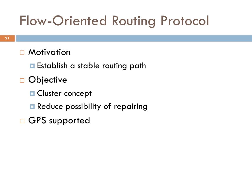 Flow-Oriented Routing Protocol • Motivation • Establish a stable routing path • Objective • Cluster concept • Reduce possibility of repairing • GPS supported