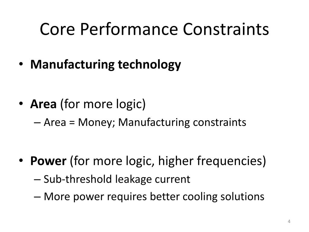 Core Performance Constraints • Manufacturing technology • Area (for more logic) • Area = Money; Manufacturing constraints • Power (for more logic, higher frequencies) • Sub-threshold leakage current • More power requires better cooling solutions