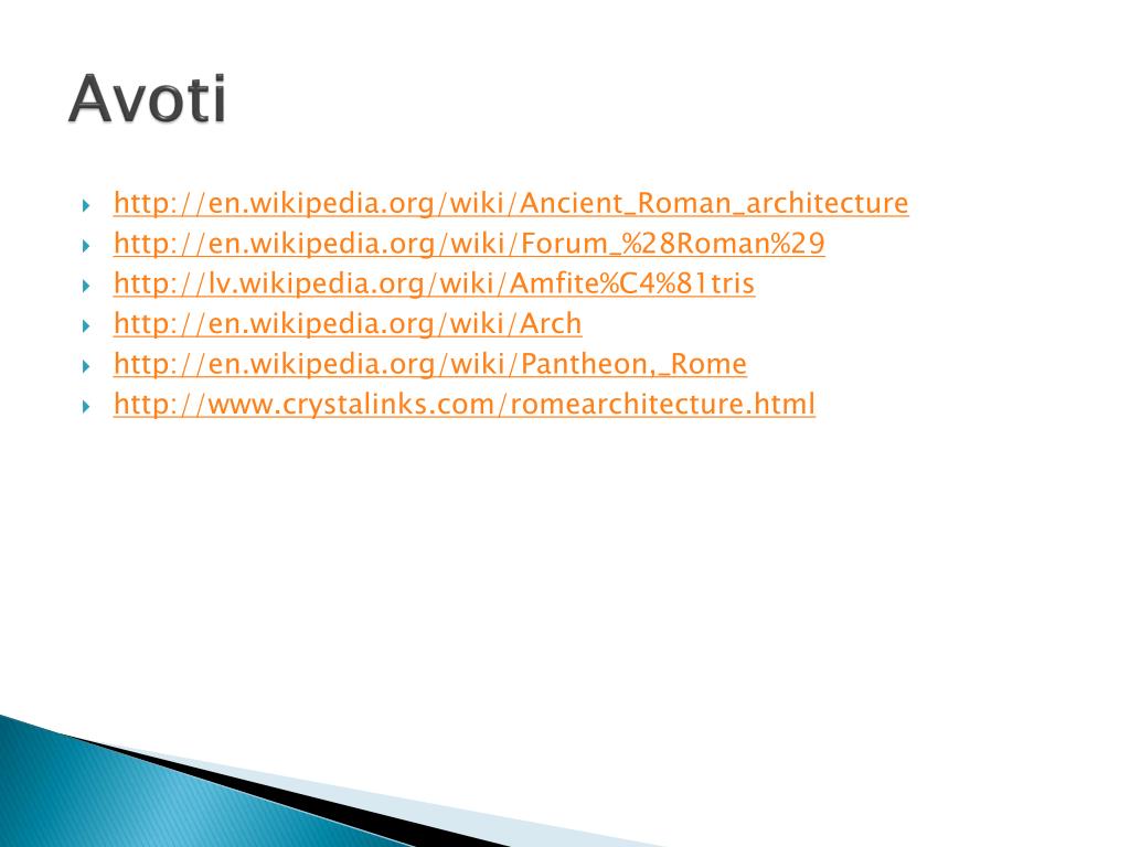 Avoti • http://en.wikipedia.org/wiki/Ancient_Roman_architecture • http://en.wikipedia.org/wiki/Forum_%28Roman%29 • http://lv.wikipedia.org/wiki/Amfite%C4%81tris • http://en.wikipedia.org/wiki/Arch • http://en.wikipedia.org/wiki/Pantheon,_Rome • http://www.crystalinks.com/romearchitecture.html
