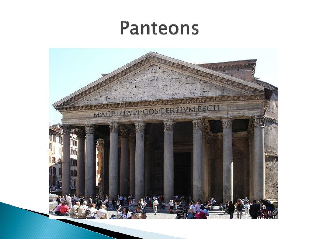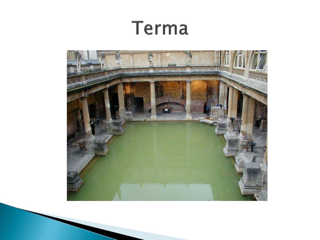 Ēku tipi • Termas – Vieta relaksācijai ūdenī, fiziskām aktivitātēm, un socializācijai. • Amfiteātri – publiska celtne, kurā skatītāju vietas iekārtotas pakāpjveidīgi ap ovālu vai apļveida arēnu. • Forums – laukums municipijā, kas galvenokārt bija rezervēts preču tirzdniecībai, liela daļa forumu tika būvēti gar ceļiem. • Panteons – Cilindriska ēka ar portiku.
