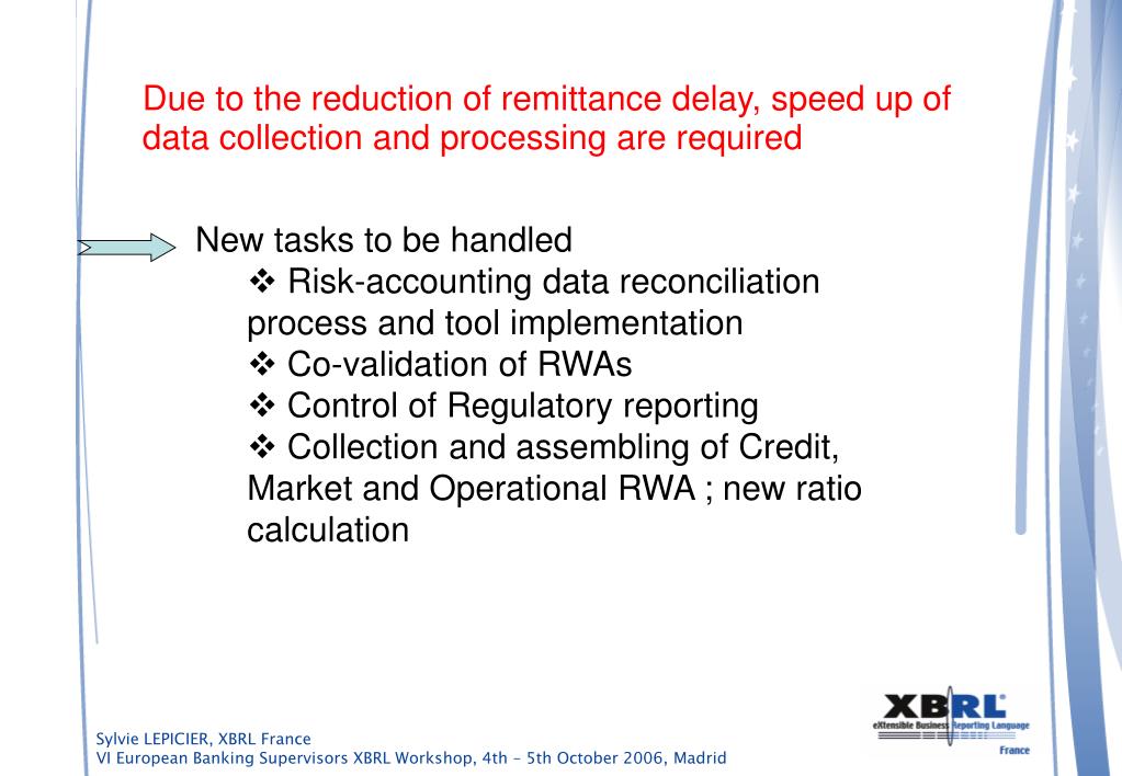 Due to the reduction of remittance delay, speed up of data collection and processing are required • Stream B : Closing process consistency “FastClose” • Speed up of data collection and processing • New tasks to be handled • Risk-accounting data reconciliation process and tool implementation • Co-validation of RWAs • Control of Regulatory reporting • Collection and assembling of Credit, Market and Operational RWA ; new ratio calculation • Stream B : Closing process consistency “FastClose” • Speed up of data collection and processing • New tasks to be handled • Risk-accounting data reconciliation process and tool implementation • Co-validation of RWAs • Control of Regulatory reporting • Collection and assembling of Credit, Market and Operational RWA ; new ratio calculation • New tasks to be handled • Risk-accounting data reconciliation process and tool implementation • Co-validation of RWAs • Control of Regulatory reporting • Collection and assembling of Credit, Market and Operational RWA ; new ratio calculation Sylvie LEPICIER, XBRL France VI European Banking Supervisors XBRL Workshop, 4th – 5th October 2006, Madrid