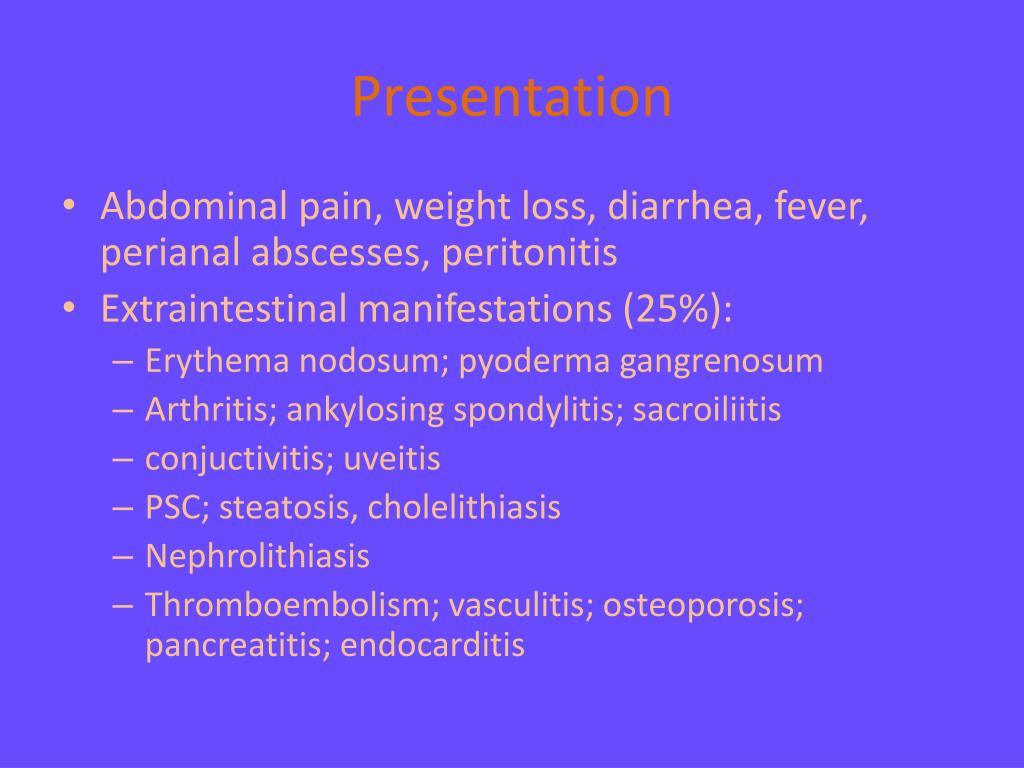 Presentation • Abdominal pain, weight loss, diarrhea, fever, perianal abscesses, peritonitis • Extraintestinal manifestations (25%): • Erythemanodosum; pyodermagangrenosum • Arthritis; ankylosingspondylitis; sacroiliitis • conjuctivitis; uveitis • PSC; steatosis, cholelithiasis • Nephrolithiasis • Thromboembolism; vasculitis; osteoporosis; pancreatitis; endocarditis