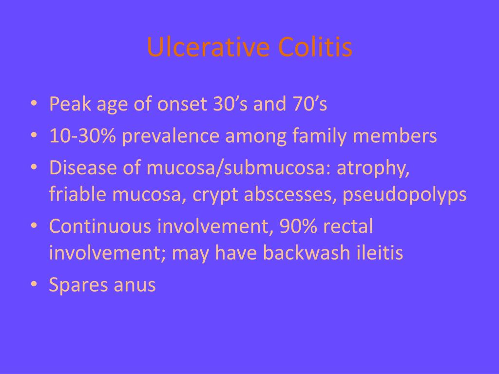 Ulcerative Colitis • Peak age of onset 30’s and 70’s • 10-30% prevalence among family members • Disease of mucosa/submucosa: atrophy, friable mucosa, crypt abscesses, pseudopolyps • Continuous involvement, 90% rectal involvement; may have backwash ileitis • Spares anus