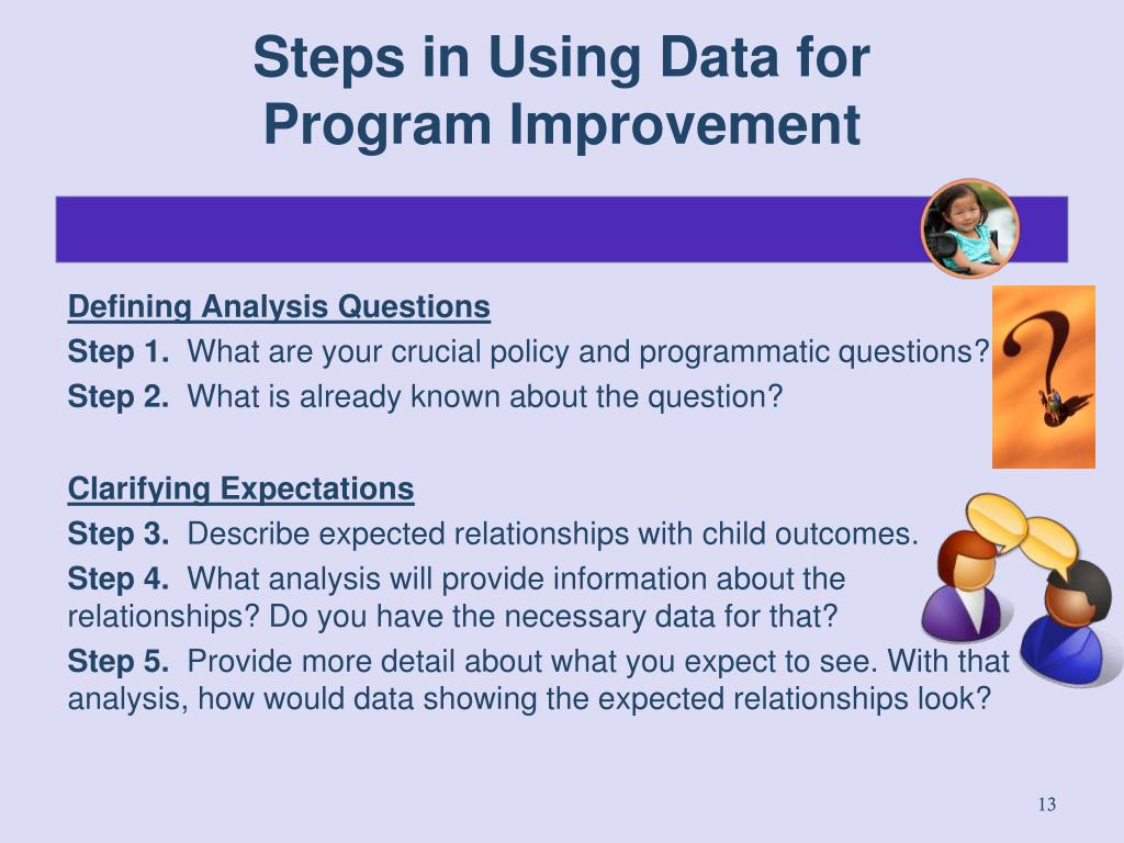 Steps in Using Data for Program Improvement Defining Analysis Questions Step 1. What are your crucial policy and programmatic questions? Step 2.What is already known about the question? Clarifying Expectations Step 3. Describe expected relationships with child outcomes. Step 4. What analysis will provide information about the relationships? Do you have the necessary data for that? Step 5. Provide more detail about what you expect to see. With that analysis, how would data showing the expected relationships look?