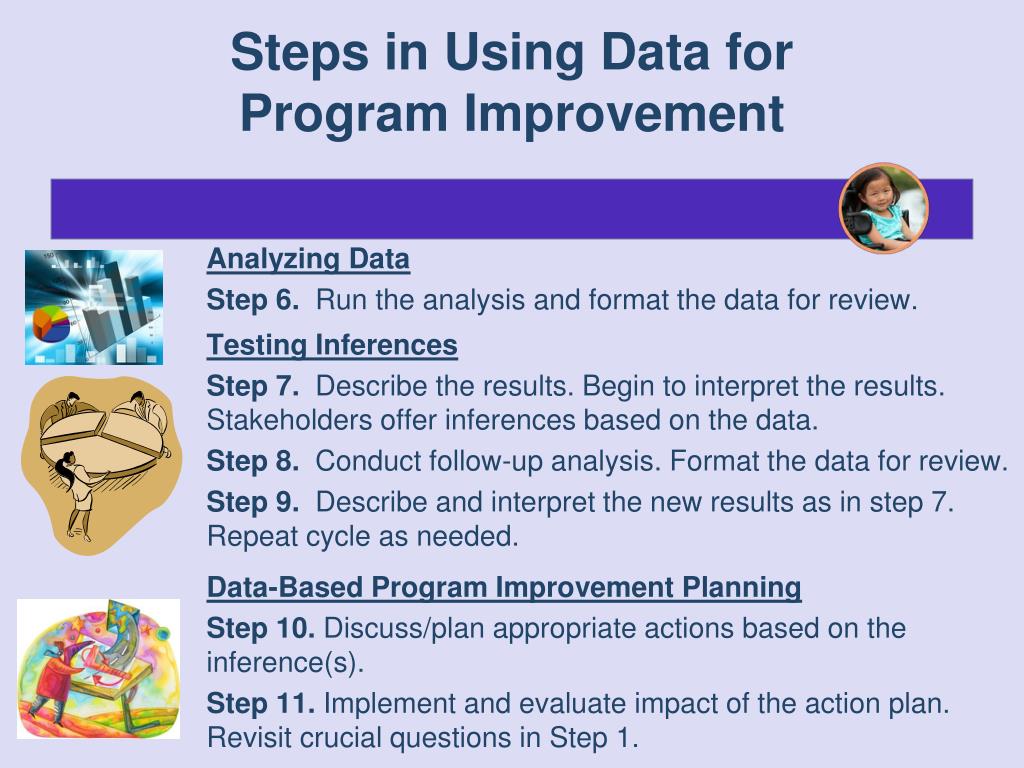 Steps in Using Data for Program Improvement Analyzing Data Step 6. Run the analysis and format the data for review. Testing Inferences Step 7. Describe the results. Begin to interpret the results. Stakeholders offer inferences based on the data. Step 8. Conduct follow-up analysis. Format the data for review. Step 9. Describe and interpret the new results as in step 7. Repeat cycle as needed. Data-Based Program Improvement Planning Step 10.Discuss/plan appropriate actions based on the inference(s). Step 11.Implement and evaluate impact of the action plan. Revisit crucial questions in Step 1.