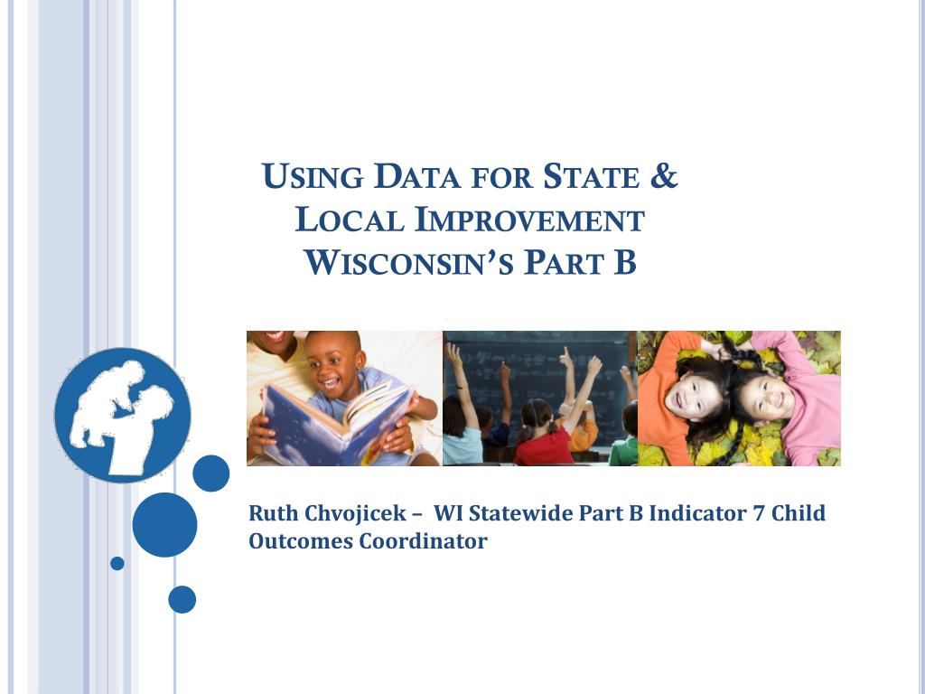 Using Data for State & Local Improvement Wisconsin’s Part B Ruth Chvojicek– WI Statewide Part B Indicator 7 Child Outcomes Coordinator