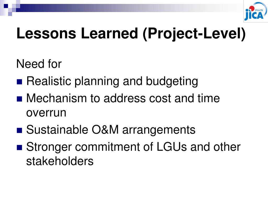 Lessons Learned (Project-Level) Need for • Realistic planning and budgeting • Mechanism to address cost and time overrun • Sustainable O&M arrangements • Stronger commitment of LGUs and other stakeholders