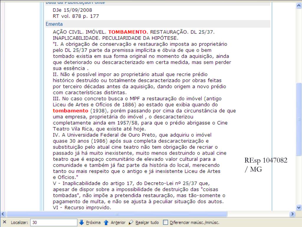 RE 219.292 –MG - STF EMENTA: Tombamento de bem imóvel para limitar sua destinação à atividades artístico-culturais. Preservação a ser atendida por meio de desapropriação. Não pelo emprego da modalidade do chamado tombamento de uso. Recurso da Municipalidade do qual não se conhece, porquanto não configurada a alegada contrariedade, pelo acórdão recorrido, do disposto no art. 216, § 1º, da Constituição.