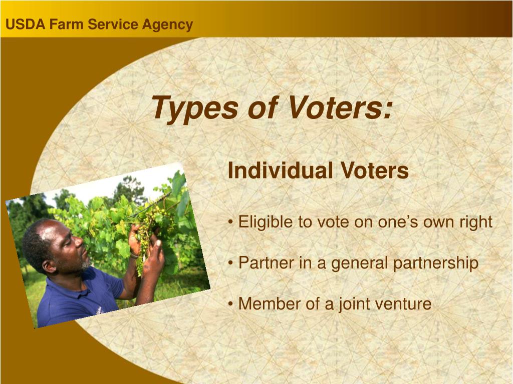Types of Voters: • Individual Voters • Eligible to vote on one’s own right • Partner in a general partnership • Member of a joint venture