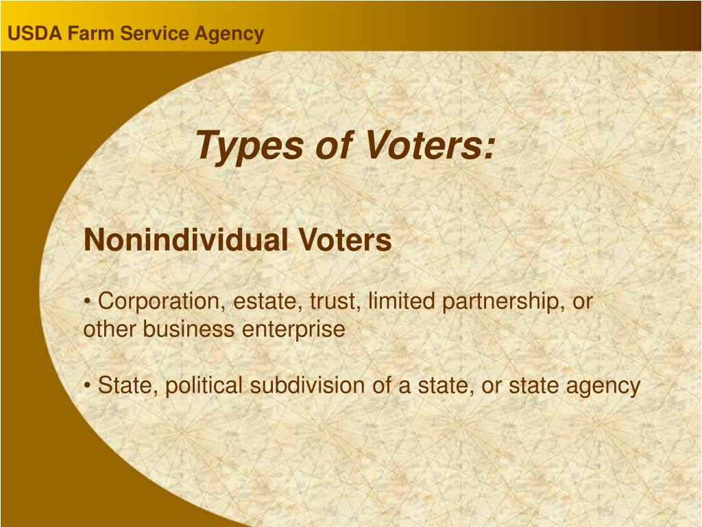 Types of Voters: • Nonindividual Voters • Corporation, estate, trust, limited partnership, or other business enterprise • State, political subdivision of a state, or state agency