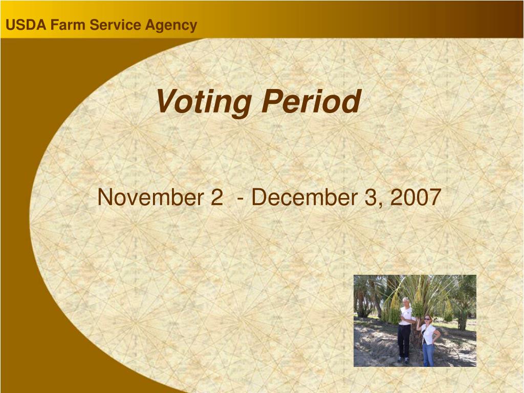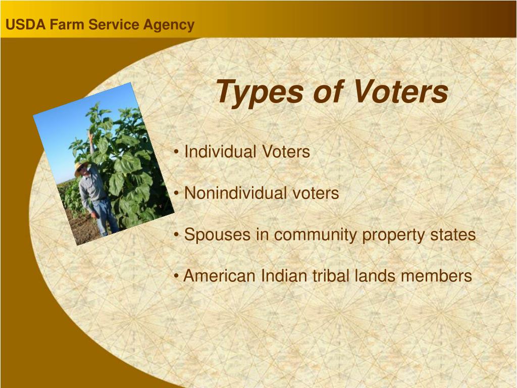 Who Can Vote? • Agricultural producer: • Of legal voting age; and • Participating/cooperating in FSA programs; or • Person younger than voting age, but supervises and conducts entire farm operation.