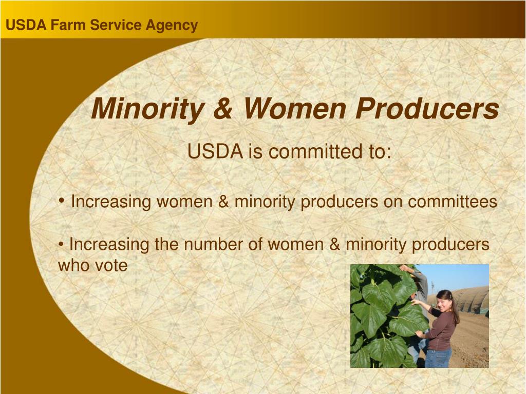 Minority & Women Producers • USDA is committed to: • Increasing women & minority producers on committees • Increasing the number of women & minority producers who vote