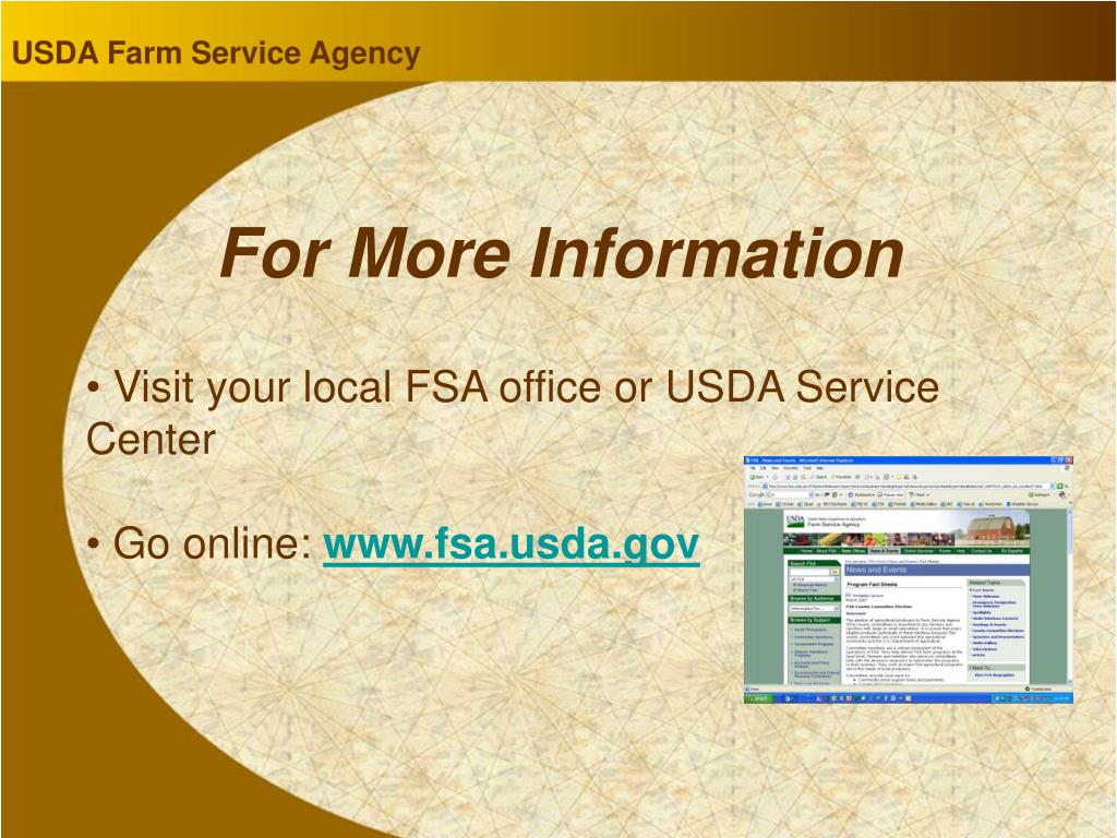 For More Information • Visit your local FSA office or USDA Service Center • Go online: www.fsa.usda.gov